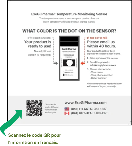Every order is accompanied by a temperature monitoring sensor specifically calibrated for Visbiome Vet that helps to ensure your order did not encounter impactful heat events during shipping.